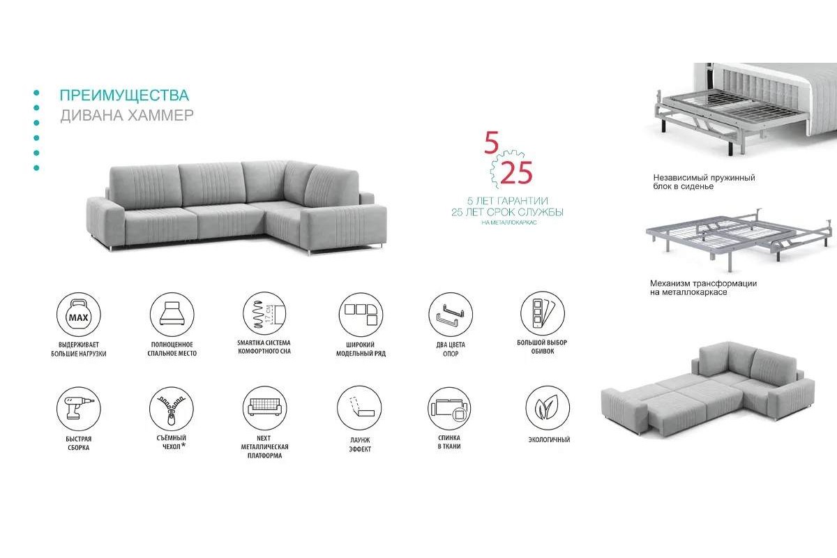 Угловой диван Хаммер NEXT с кресельной секцией с шир. подлокотниками тик-так микровелюр серый 345х93х245 металлокаркас артикул 10414006