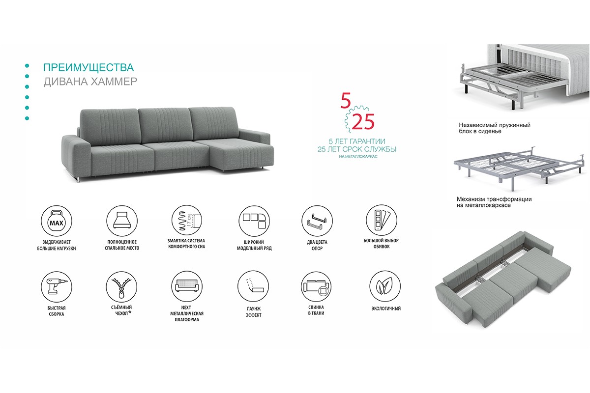 Угловой диван Хаммер NEXT с широкими подлокотниками тик-так рогожка зеленый 355х93х169 металлокаркас артикул 10406131