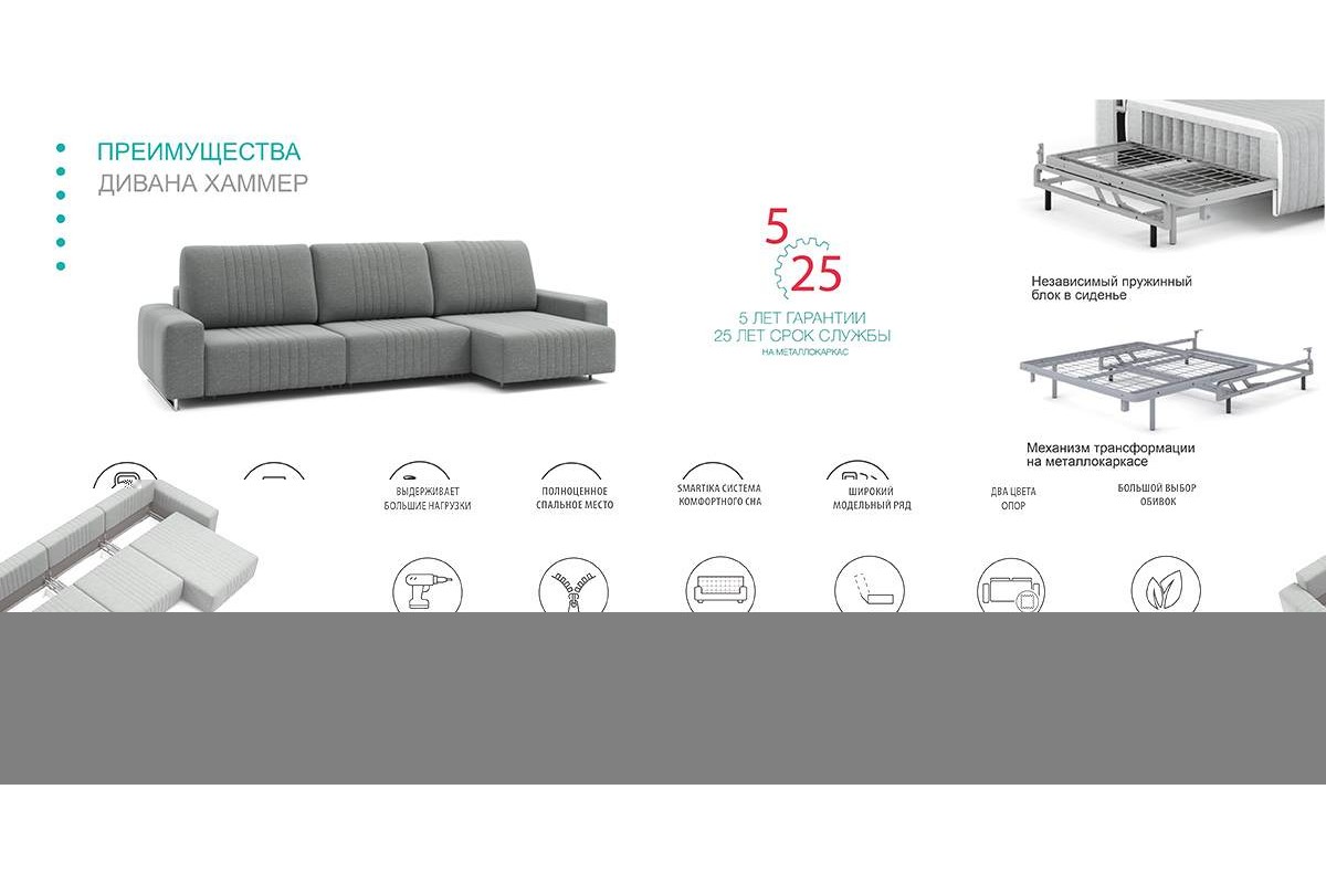 Угловой диван Хаммер NEXT с широкими подлокотниками тик-так рогожка серый 355х93х169 металлокаркас артикул 10406137